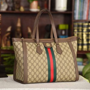 The Gucci Ophidia GG Supreme Tote Bag effortlessly blends heritage style with modern functionality. Crafted from Gucci’s iconic GG Supreme canvas, this tote features the instantly recognizable green-red-green Web stripe at its center—a tribute to the brand’s equestrian roots. Trimmed with brown leather and adorned with gold-tone double G hardware, it strikes the perfect balance between sophistication and practicality.